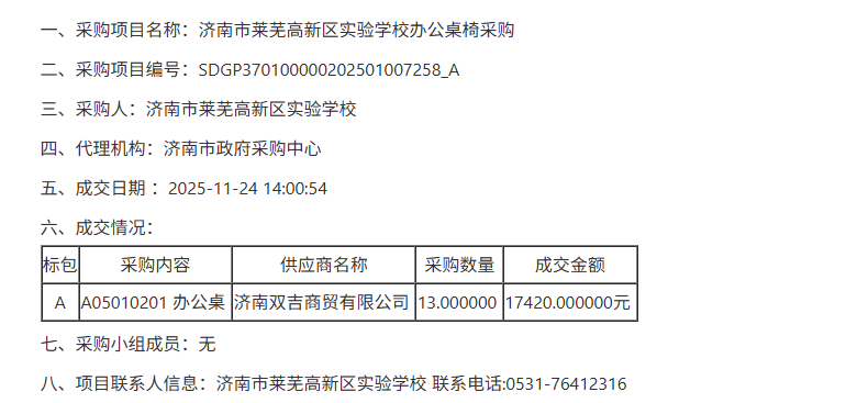 济南市莱芜高新区实验学校办公桌椅采购成交公告